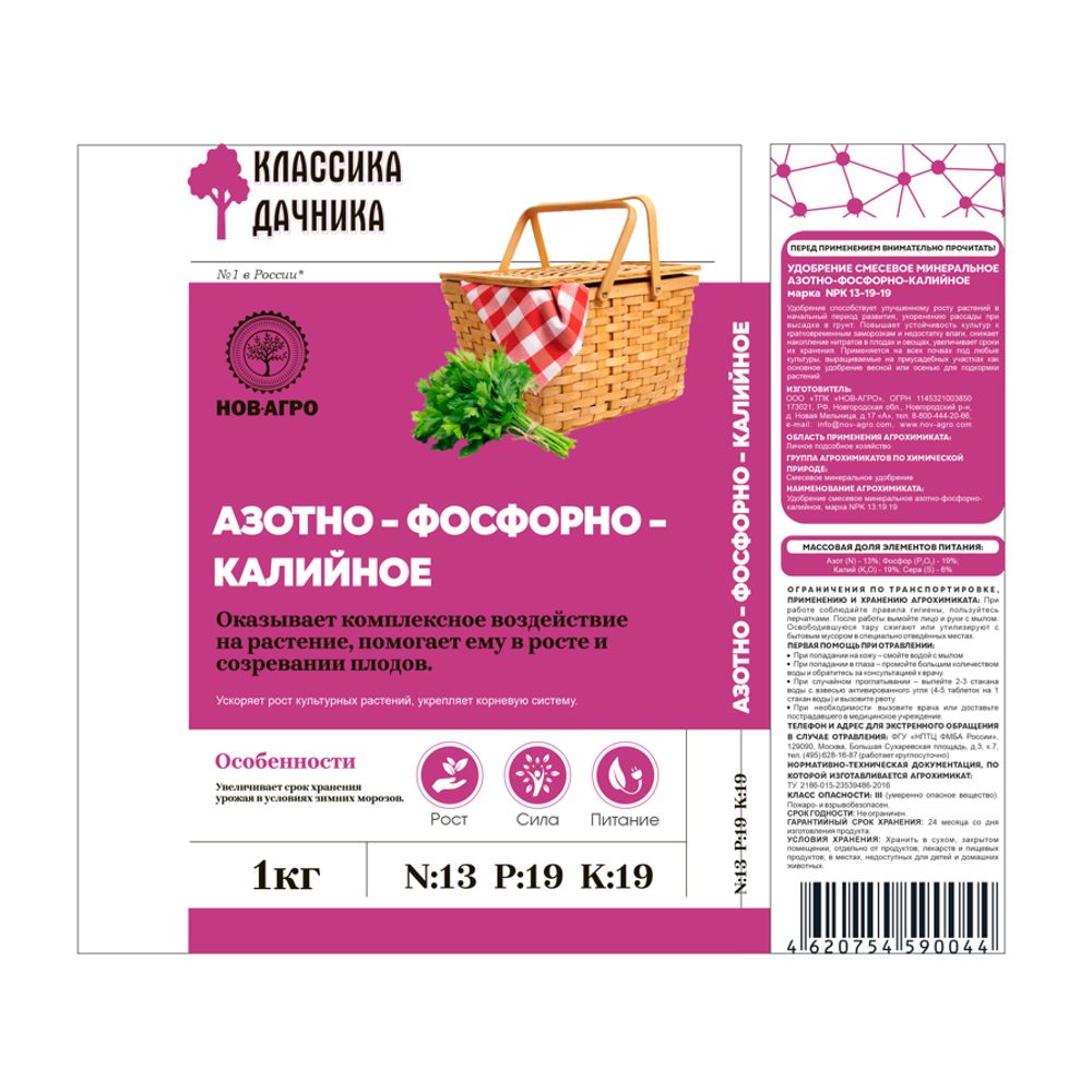 Удобрение минеральное Азотно-фосфорно-калийное, 1 кг. Азотно-Фосфорно-Калийное удобрение - полное, сложное, комплексное, гранулированное удобрение, с соотношением питательных веществ 1:1,5:1,5. Фосфор и все питательные элементы находятся в водорастворимой форме. Применяется повсеместно, под любые культуры и типы почв. Состав: N-13%, P2O5 - 19%, K2O - 19%