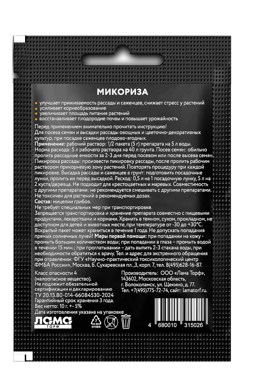• Рабочий раствор: 1/2 пакета (5 г) растворить в 5 л воды.
