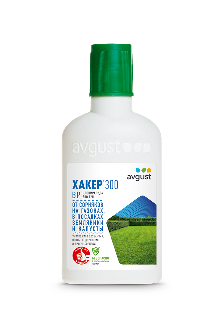 Уничтожает сорняки, не повреждая злаковые газонные травы, капусту и землянику.