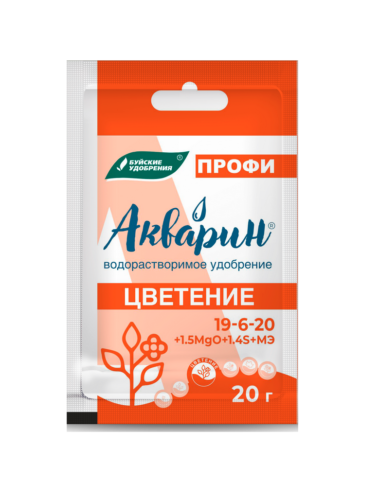 "Акварин Профи" цветение - водорастворимое удобрение, в состав которого входит азот, фосфор, калий, магний, сера и микроэлементы – железо, цинк, марганец, медь в хелатной форме, а бор и молибден – в минеральной. Благодаря кислой реакции (рН) удобрения, оно легко растворяется в холодной воде и более эффективно усваивается корневой системой или листовой поверхностью растений. Рекомендуем хранить в сухом, прохладном месте. Готовые растворы необходимо использовать полностью.