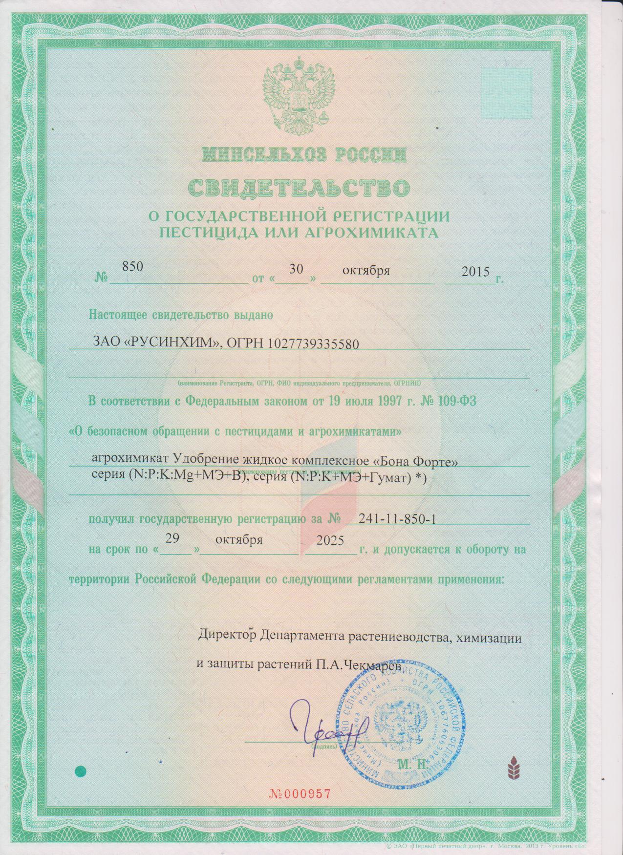 Состав: азот - не менее 3%, фосфор - не менее 5%, калий - не менее 7%, магний - не менее 0,3%, бор - не менее 0,002%, цинк - не менее 0,002%, медь - не менее 0,0004%, молибден - не менее 0,0004%, кобальт - не менее 0,0002%.